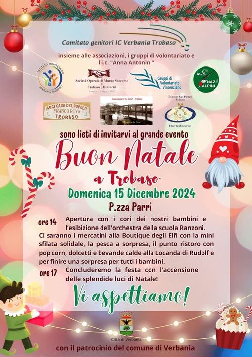 Il Comitato e lieto di presentare con l'aiuto de l'Istituto Comprensivo Anna Antonini di Verbania Trobaso,la S.O.M.S. di Trobaso, l’associazione “LA GERA”, il gruppo Volontariato Vincenziano di Trobaso, l’Associazione Nazionale Alpini di Possaccio, l’Oratorio di San Pietro a Trobaso e il circolo Arci casa del popolo Franco Riva Trobasola festa "Buon Natale a Trobaso".Il 15 dicembre in piazza Parri.
