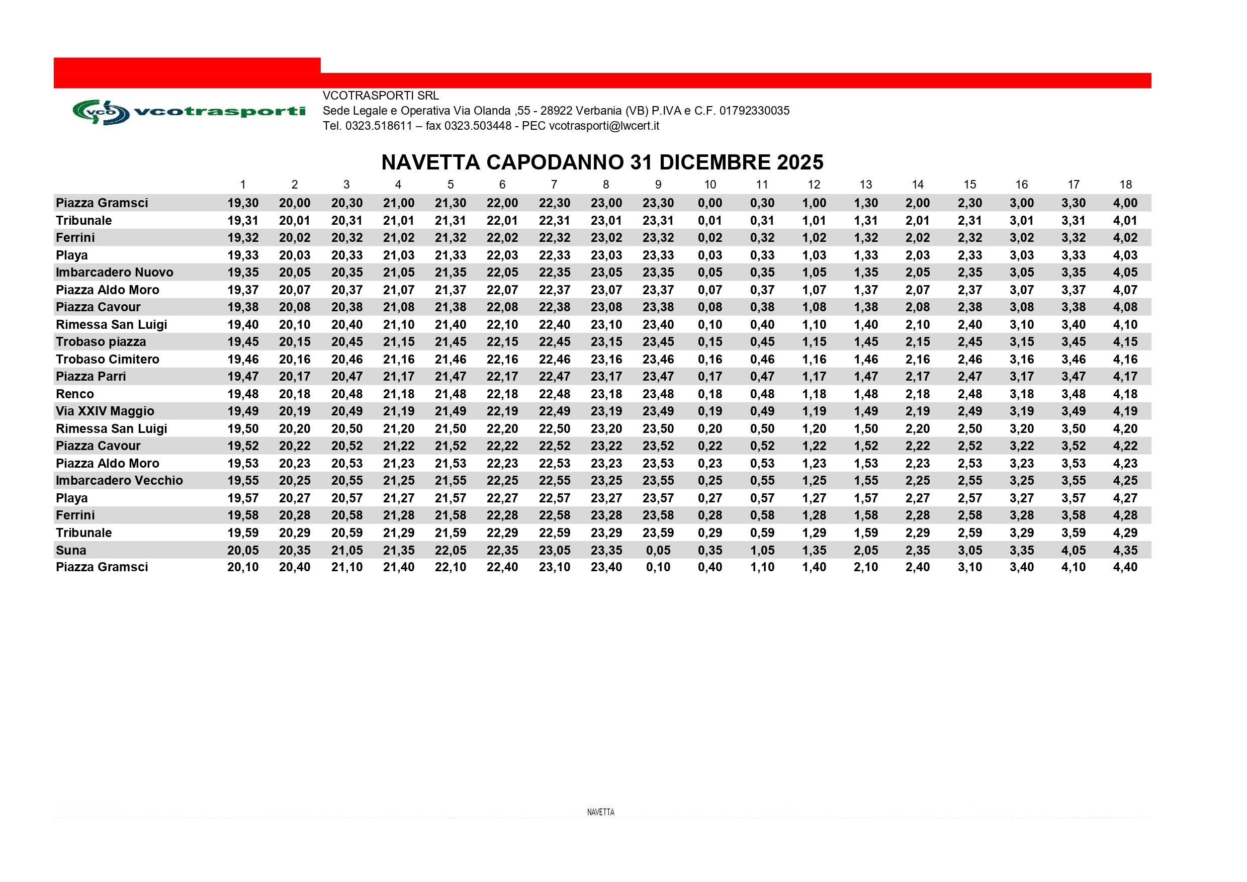 Navetta gratuita in partenza da Piazza Gramsci, con direzione Intra e successiva fermata a Trobaso Piazza Parri, quindi rientro fino a Suna.