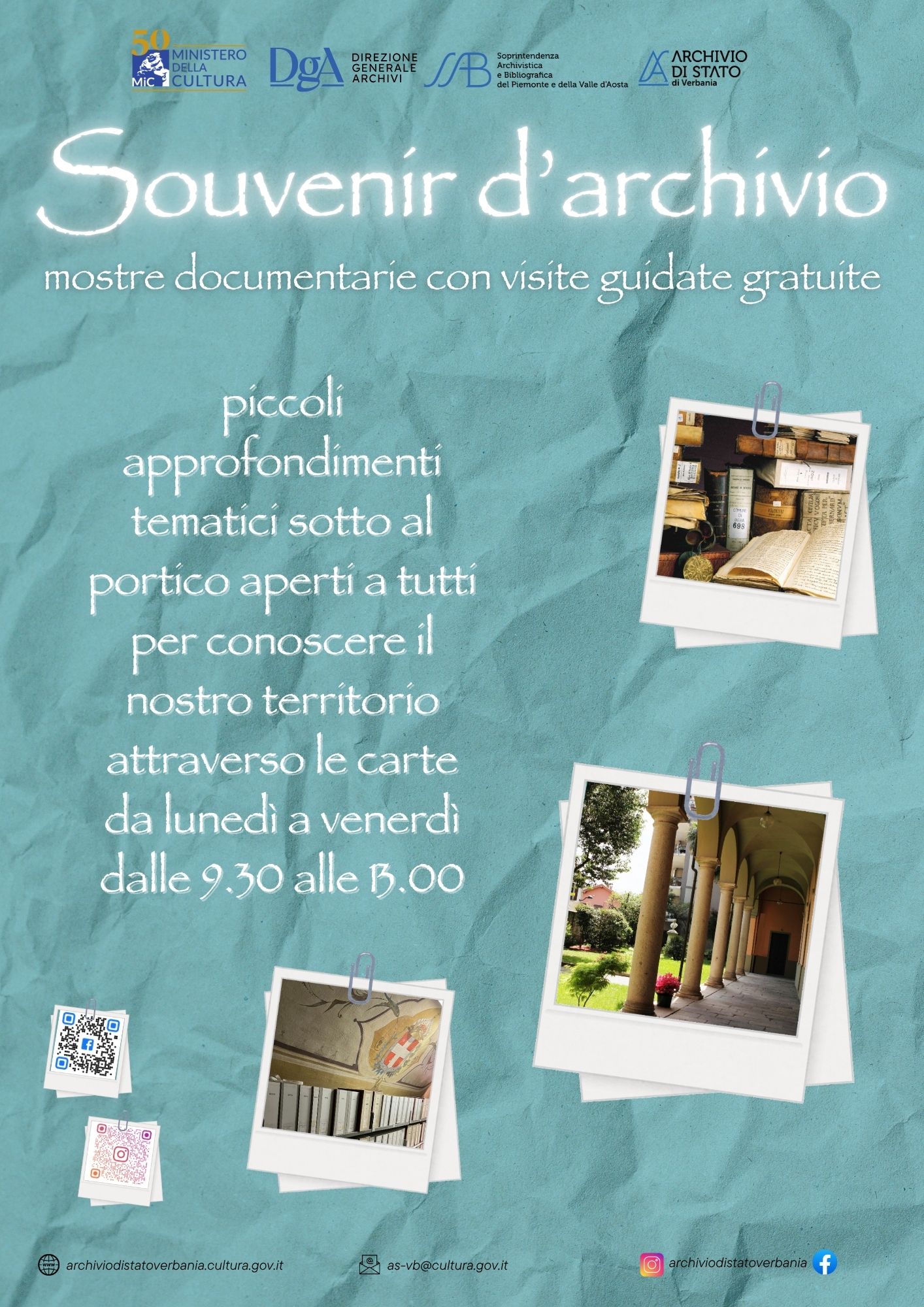 L’Archivio di Stato di Verbania, nell’ottica della valorizzazione del patrimonio documentario, accoglierà studiosi, cittadini e visitatori per tutta l’estate; l’apertura straordinaria riproporrà alcune delle mostre documentarie di maggior successo, come la recente “#futura: un territorio in movimento” (dall’1 al 31 luglio) che traccia una fitta rete di progetti sui trasporti ferroviari, lacuali ed anche alcune sorprese!